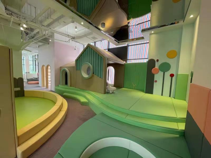 在阿貍的童話世界設計中,我們通過對紅、綠、黃等主要色塊的搭配與協調,打造了極具吸引力的視覺效果,配充滿童夢風格的阿貍元素背景墻,營造整體空間的溫暖風格,以此讓兒童在安全放松、氣氛明快、活躍的游樂環境中享受玩耍所帶來的酣暢愉悅感。
